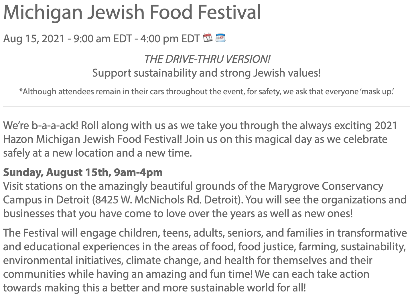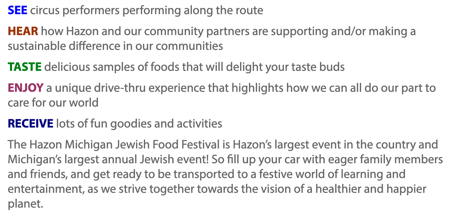 We’re b-a-a-ack! Roll along with us as we take you through the always exciting 2021 Hazon Michigan Jewish Food Festival! Join us on this magical day as we celebrate safely at a new location and a new time.