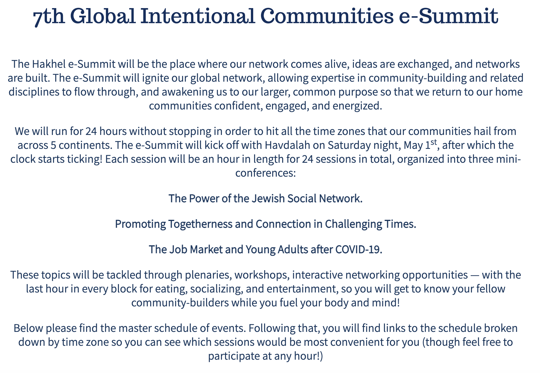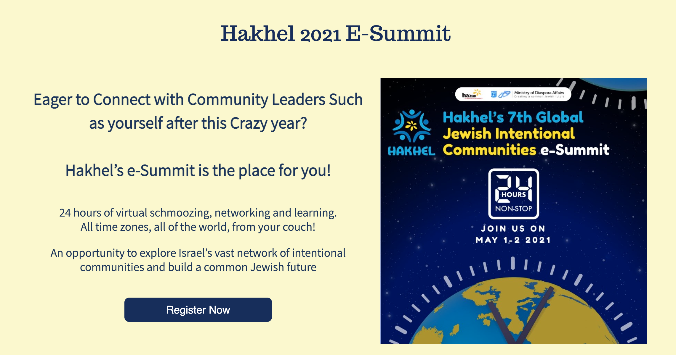 The Hakhel e-Summit will be the place where our network comes alive, ideas are exchanged, and networks are built. The e-Summit will ignite our global network, allowing expertise in community-building and related disciplines to flow through, and awakening us to our larger, common purpose so that we return to our home communities confident, engaged, and energized.